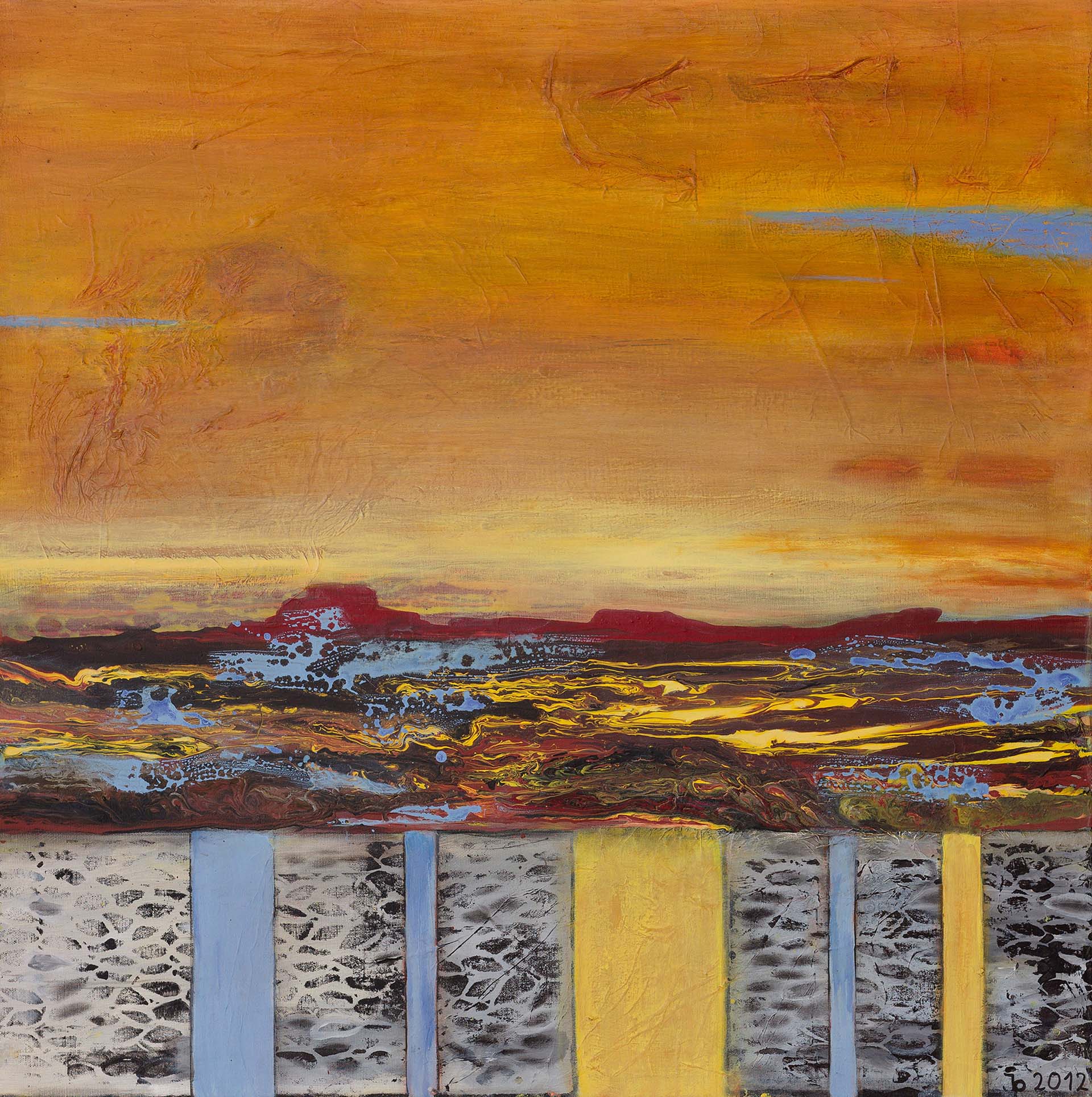 Allerdings könnten die Bilder auch eine abstrakte Darstellung von Emotionen und Empfindungen repräsentieren. Mit Dammar und Schelllack setzt Jenny Passet neben Acryl, Tusche und Pigmenten, gelegentlich auch Materialien aus der traditionellen Malerei ein, die sie für ihre Zwecke eigenwillig interpretiert. Es ist ein langer Malprozess, bei dem die Bilder sich in vielen Schichten aufeinander aufbauen. Das Schichtprinzip lässt die Komposition erst richtig wachsen. Passet arbeitet in Farbklängen, meistens in Serien und immer mit Musik, die in ihre Bilder eingeht, ihr Schwung gibt und sich auf die Bilder überträgt. Auch der Zufall wird bewusst in die Bildentstehung einkalkuliert. So ist es genau die Kombination und das Zusammenspiel von dem Experimentellen mit dem Malerischen und dem Zeichnerischen, die das Wesen von Passets Bildern ausmacht. Die Kompositionen von Jenny Passet bewegen sich in dem Spannungsfeld von zart und poetisch bis kraftvoll und farbintensiv.